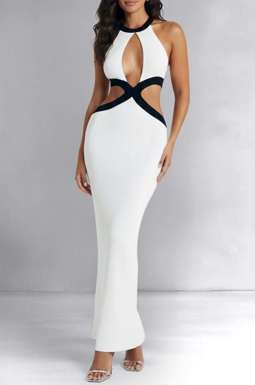 White Black Contrast Trim Cut Out Halter Knit Keyhole Maxi Dress