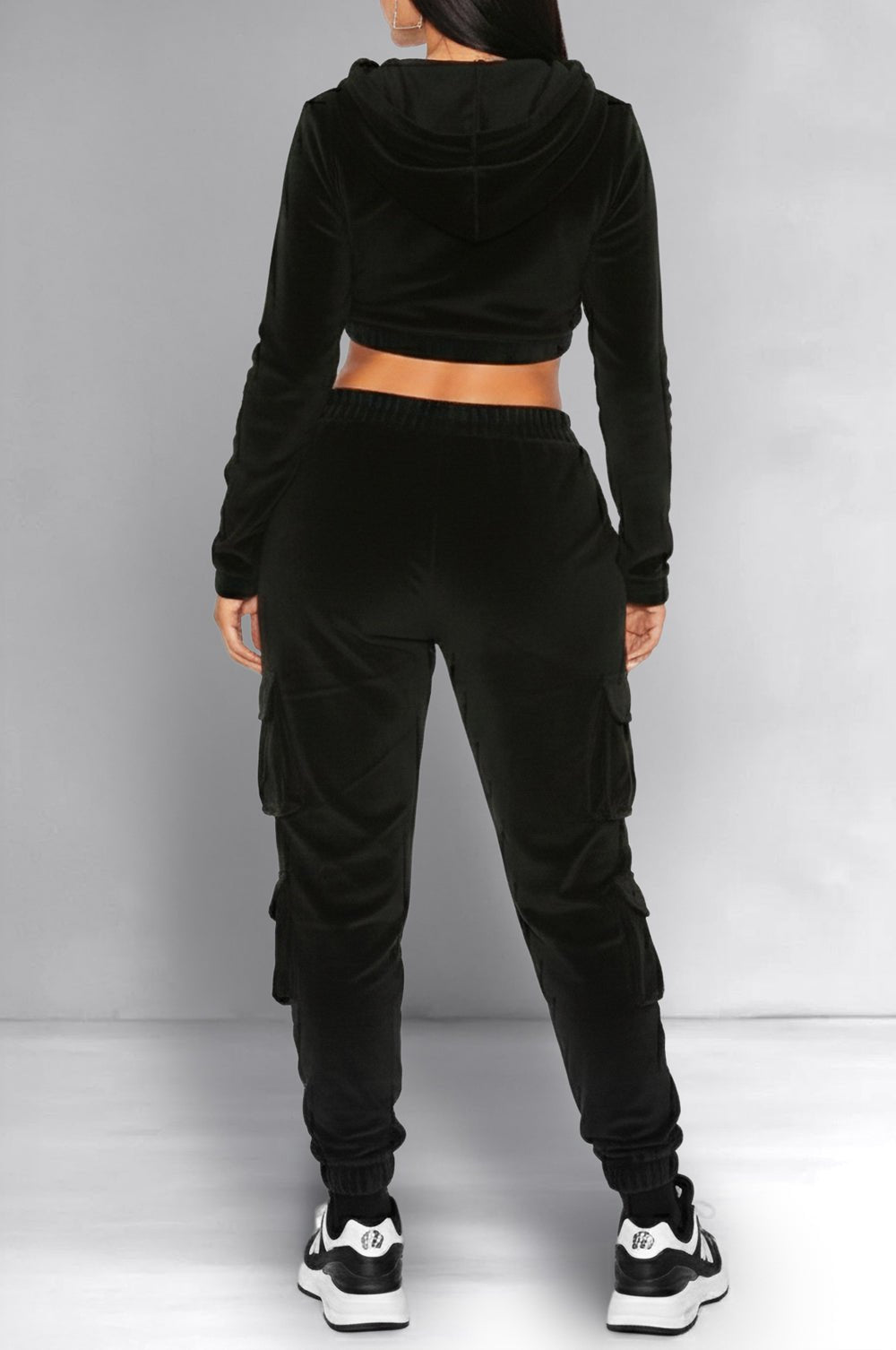 Black Velour Long Sleeve Zip Up Hooded Cargo Joggers Two Piece Set
