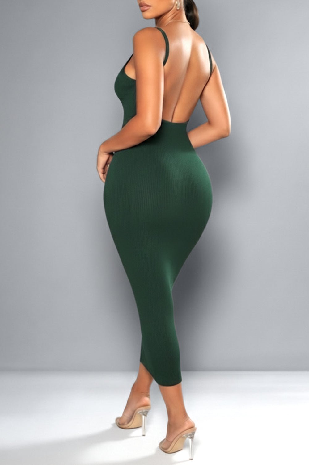 Regular price $69.38Slip right in this bodycon dress. Made of stretchy ribbed fabric that will hug and shape your body with feminine scoop back on a midi length.