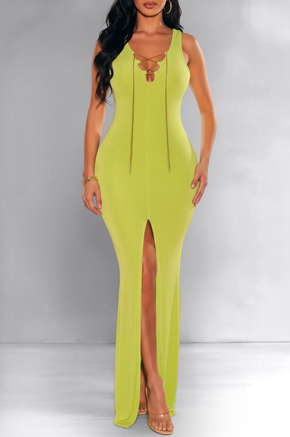 Lime Sleeveless Gold Chain Lace Up Slit Gown