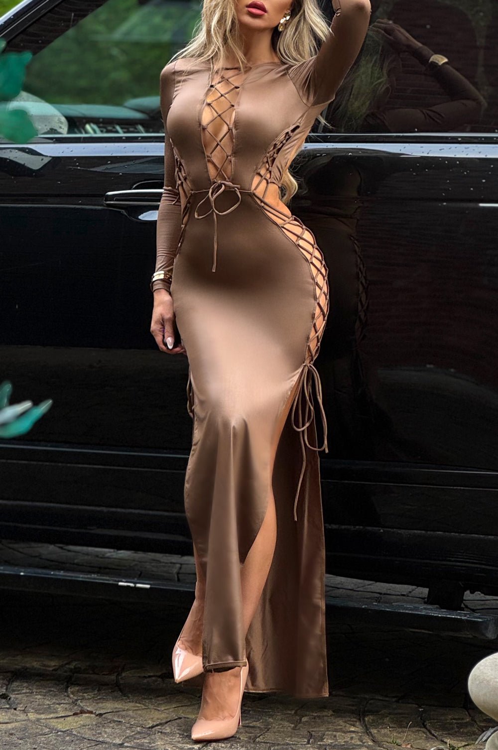 Regular price $76.32Turn heads in this mocha faux leather masterpiece. Designed with bold lace-up detailing, sultry cutouts, and dramatic double slits, this long-sleeve dress sculpts your curves with confidence.