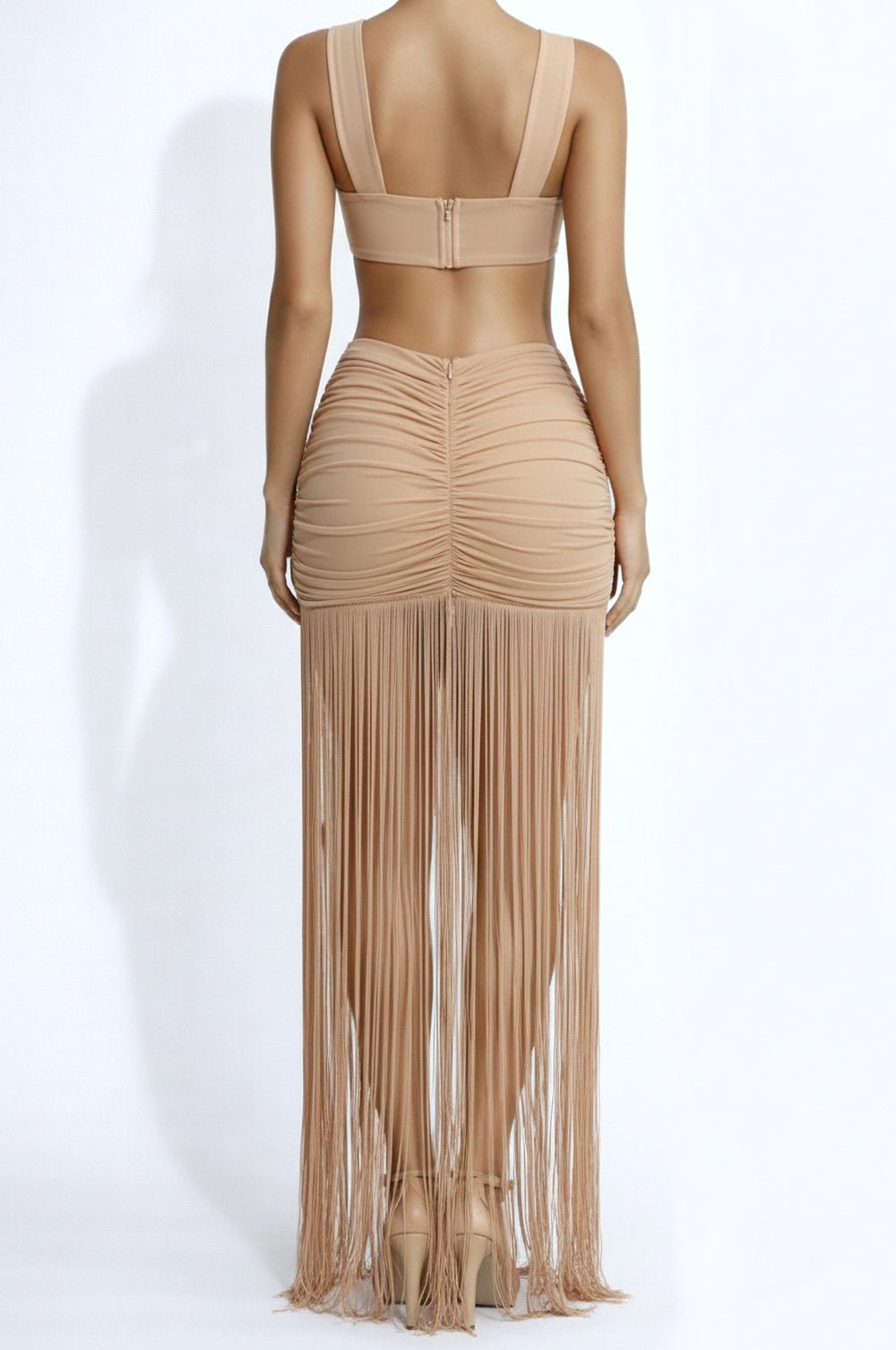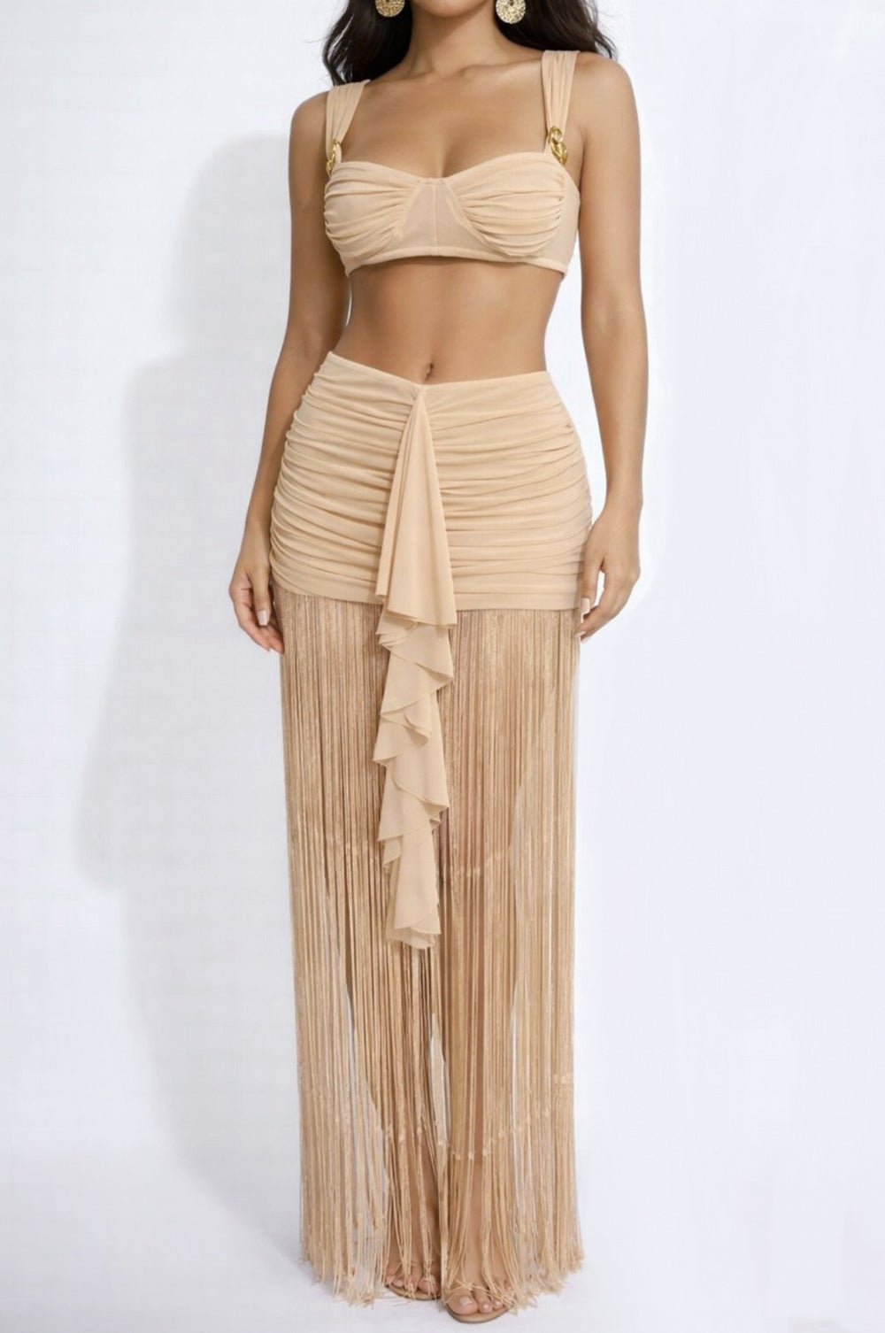 Nude Fringe Draped Mesh Ruched Skirt Two Piece Set