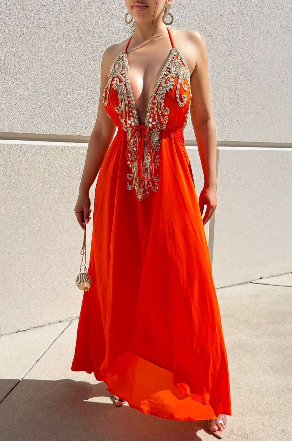 Regular price $166.70You will look and feel like a goddess in this beautiful dress. Intricately detailed in rhinestones at the neckline, featuring a halter style that ties at the back with an adjustable drawstring at bust and a flowy silhouette.