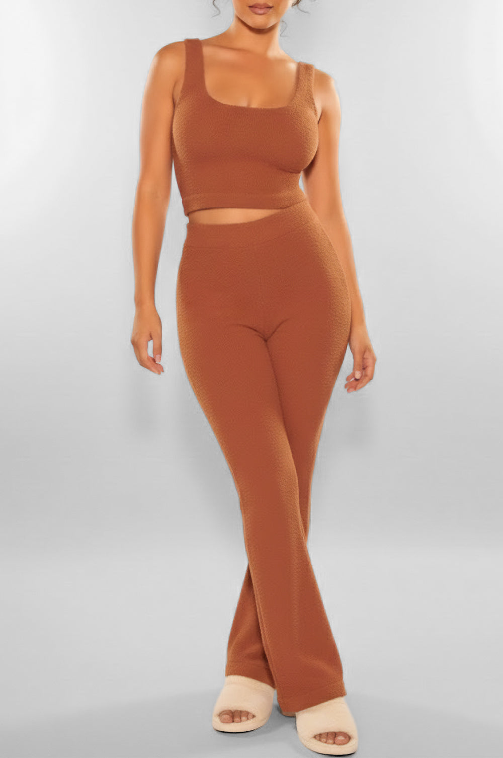 Regular price $41.91An effortless escape into comfort. This Toffee Bouclé Palazzo Two Piece Set is crafted from plush, cloud-soft bouclé that feels like a gentle reset. With a relaxed yet refined silhouette, this set is made for quiet moments, soft mornings, and embracing ease and chic comfort.