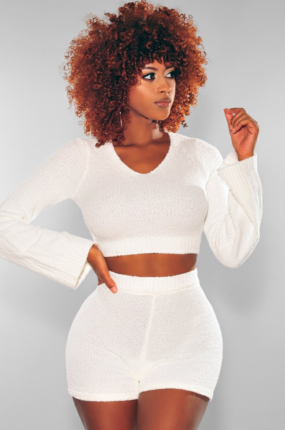 Regular price $34.92An effortless escape into comfort. This White Bouclé Bell Sleeves Shorts Two Piece Set is crafted from plush, cloud-soft bouclé that feels like a gentle reset. With a relaxed yet refined silhouette, this set is made for quiet moments, soft mornings, and embracing ease and chic comfort.