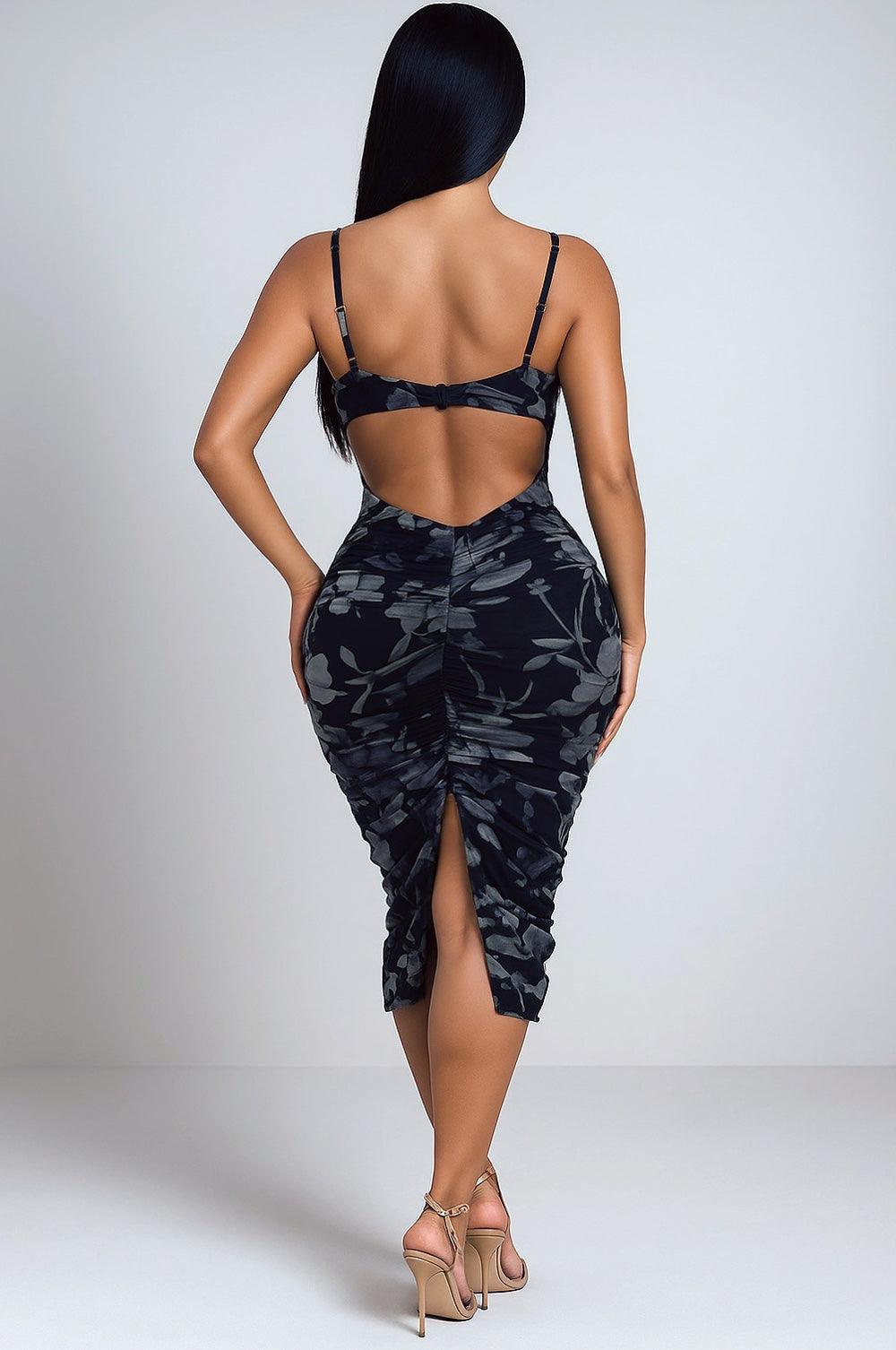 Black Floral Print Ruched Scrunch Butt Cut Out Midi Dress