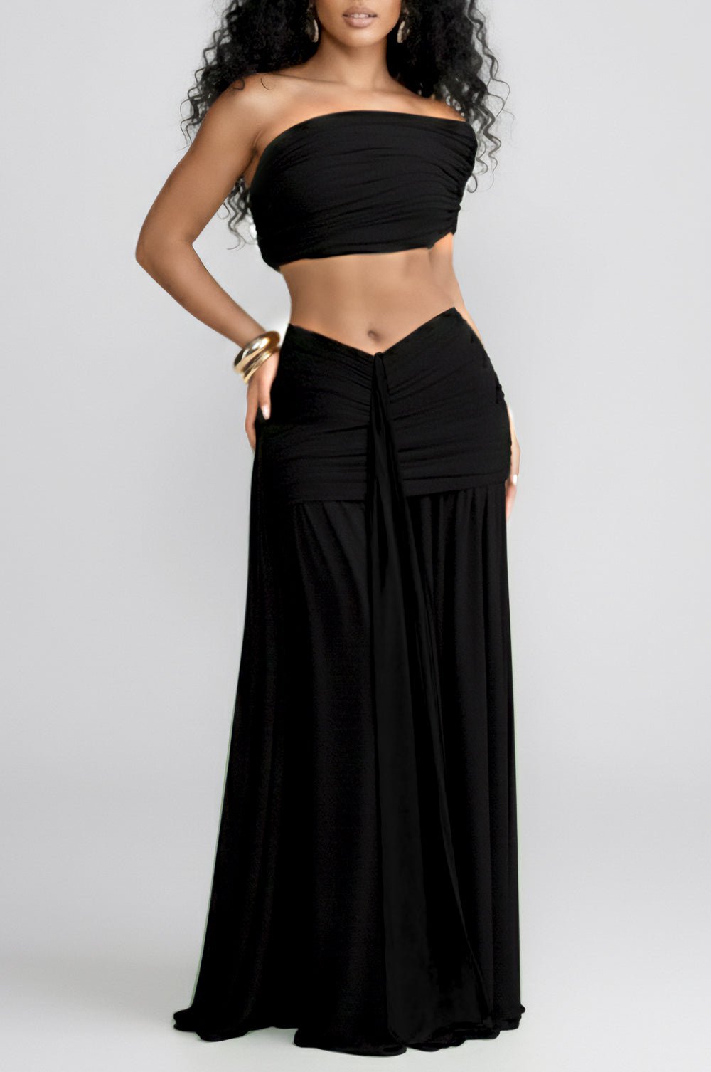 Regular price $69.99Effortlessly luxe, the Black Off-Shoulder Ruched Draped Skirt Two-Piece Set delivers modern goddess energy with a vacation-ready feel. Fully lined and double layered for a buttery soft smooth finish, the off-the-shoulder top features a cropped design. The matching skirt includes a ruching scrunch-butt design to enhance curves from every angle. Crafted from a stretchy, body-hugging fabric, this set is perfect for sunset dinners, resort nights, and elevated escapes.