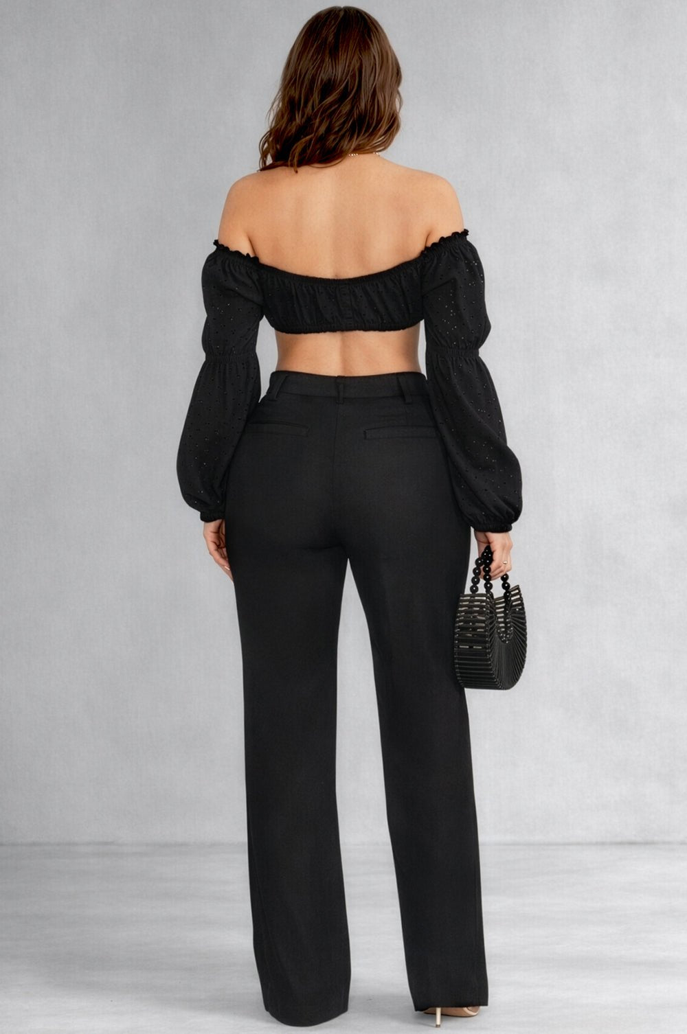 Black Peasant Tie Up Long Sleeve High Waist Palazzo Pant Two Piece Set