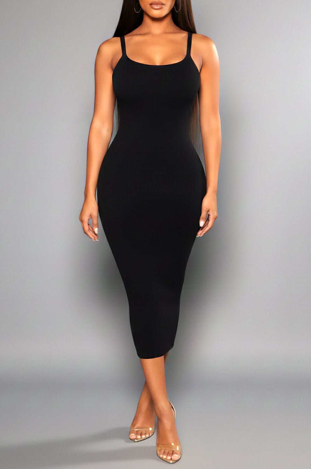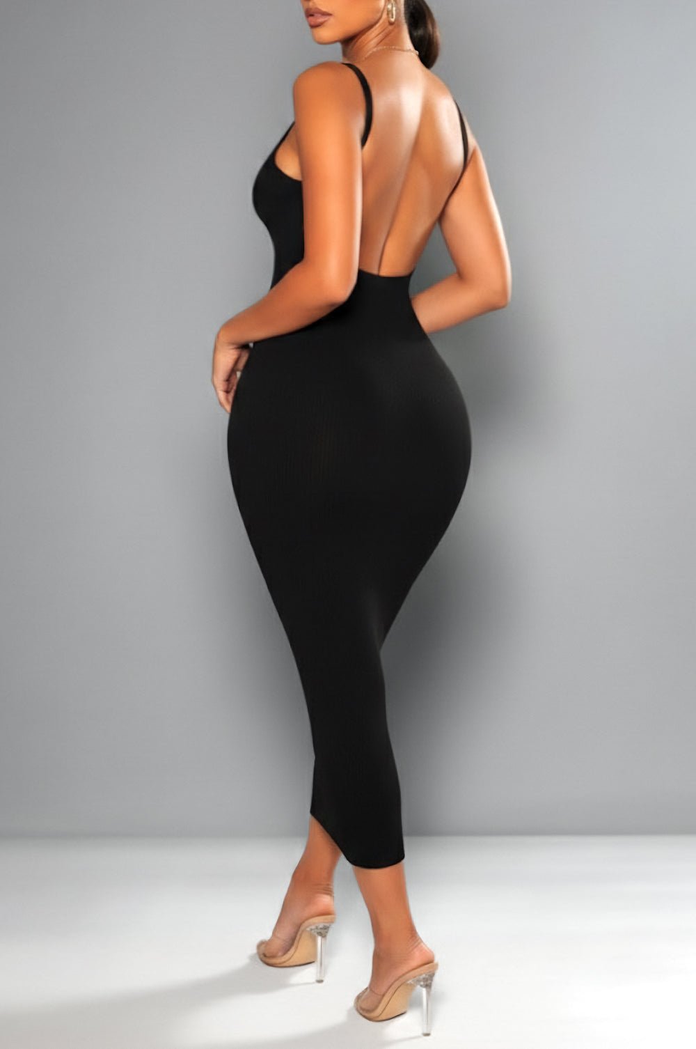 Regular price $49.99Slip right in this bodycon dress. Made of stretchy ribbed fabric that will hug and shape your body with feminine scoop back on a midi length.