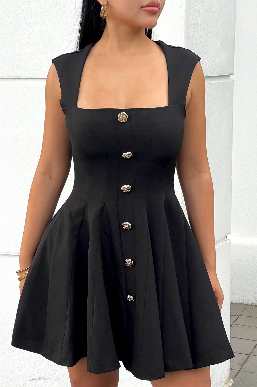 Regular price $69.99This elegant mini LBD showcases a square neckline, delicate rose buttons, and a pleated flare silhouette.