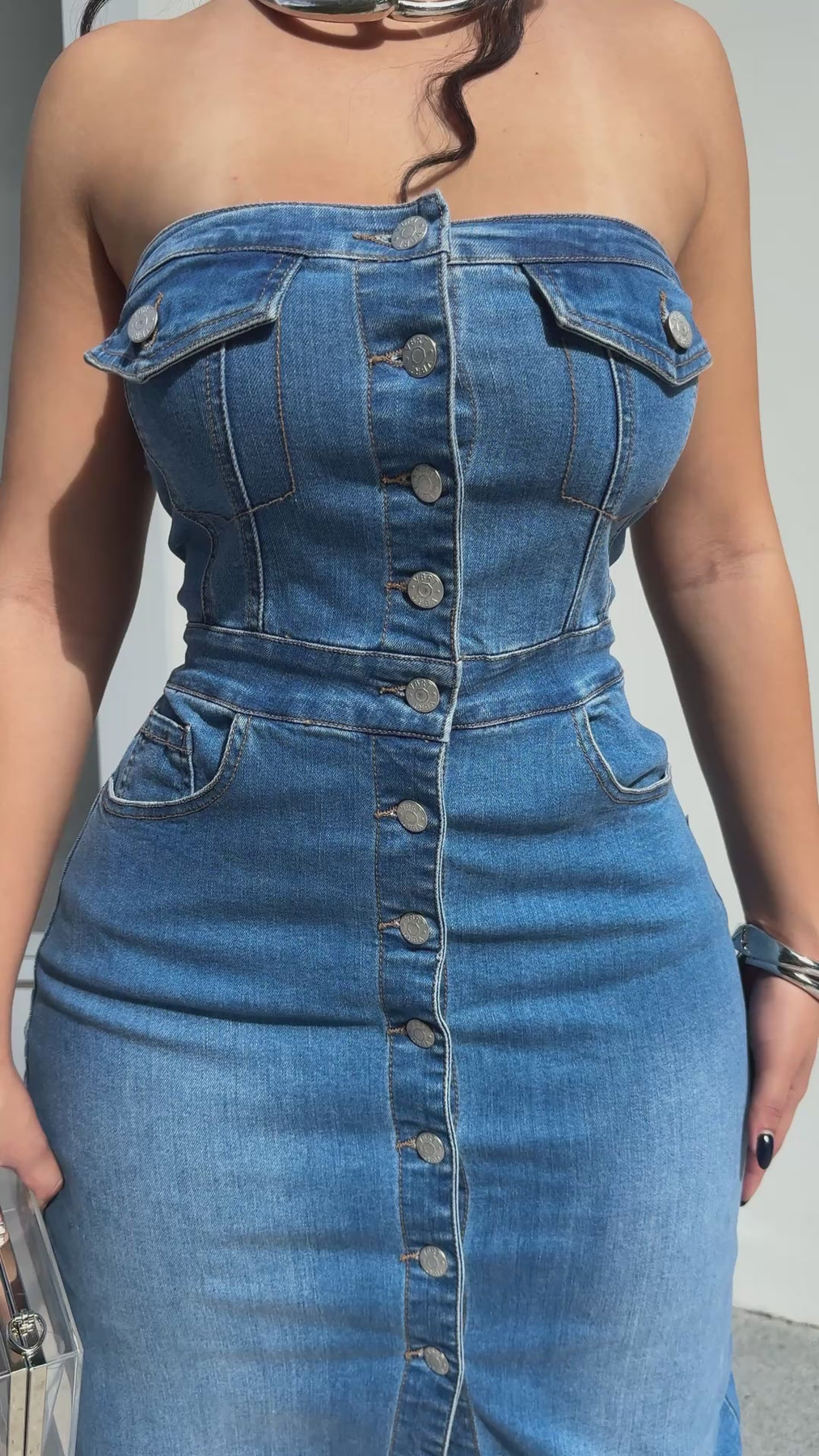 Regular price $69.99Turn up the edge in this denim dress — featuring a strapless neckline, front button-down detailing, and a slit that keeps it effortlessly chic. Perfect for a day-to-night denim moment.