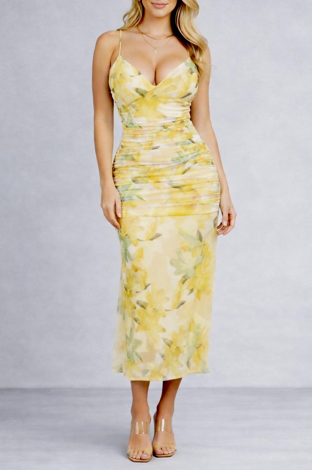 Lemon Floral Print CrissCross Ruched Mesh Dress