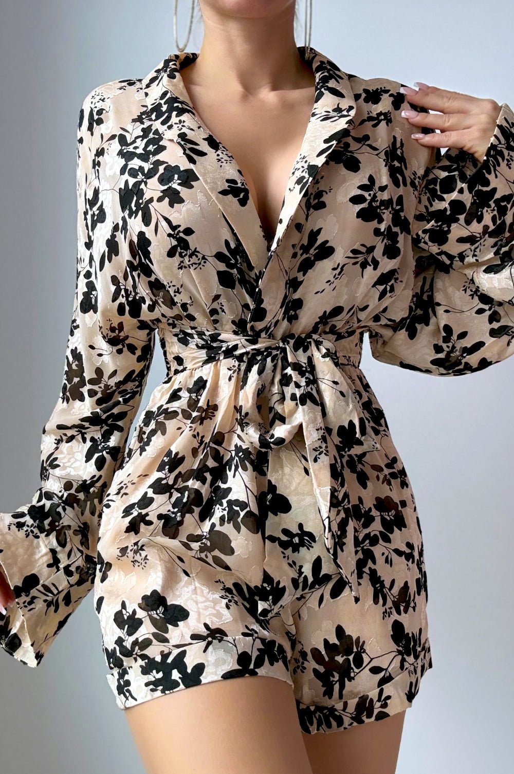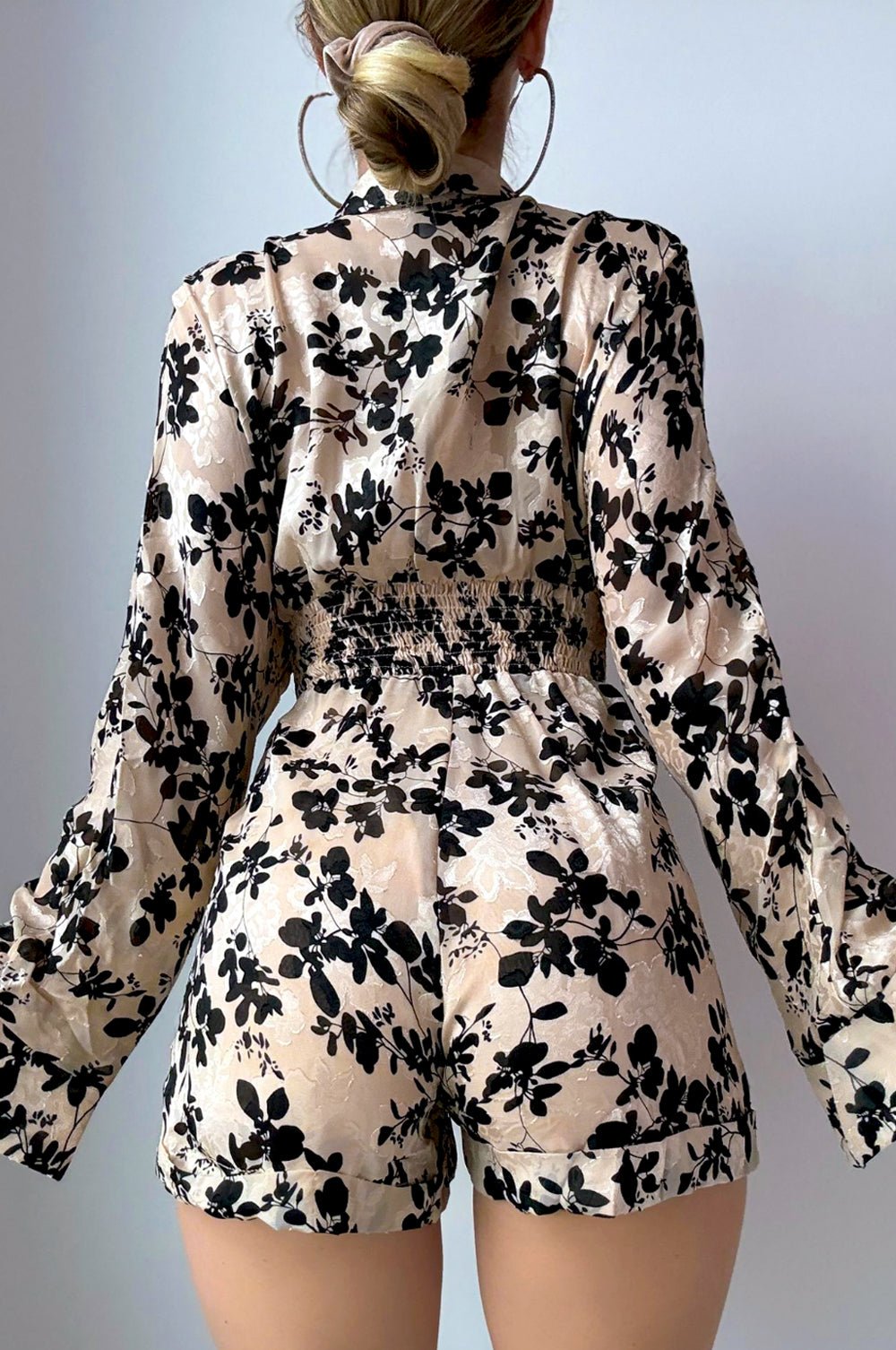 Regular price $64.99Make a bold statement with this deep V-neck romper featuring a nude and black floral print and a stylish tie-up detail, perfect for turning heads wherever you go.