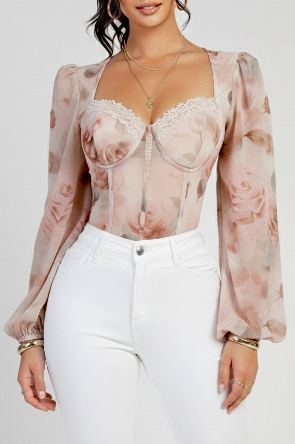 Regular price $42.99Designed to feel soft, romantic, and timeless, the Pink Floral Print Bustier Bodysuit showcases a floral mesh body with lace trim and a sculpting sweetheart neckline. Padded lined cups provide support, while the snap-button gusset ensures a smooth, secure fit. A romantic essential with an elevated finish.