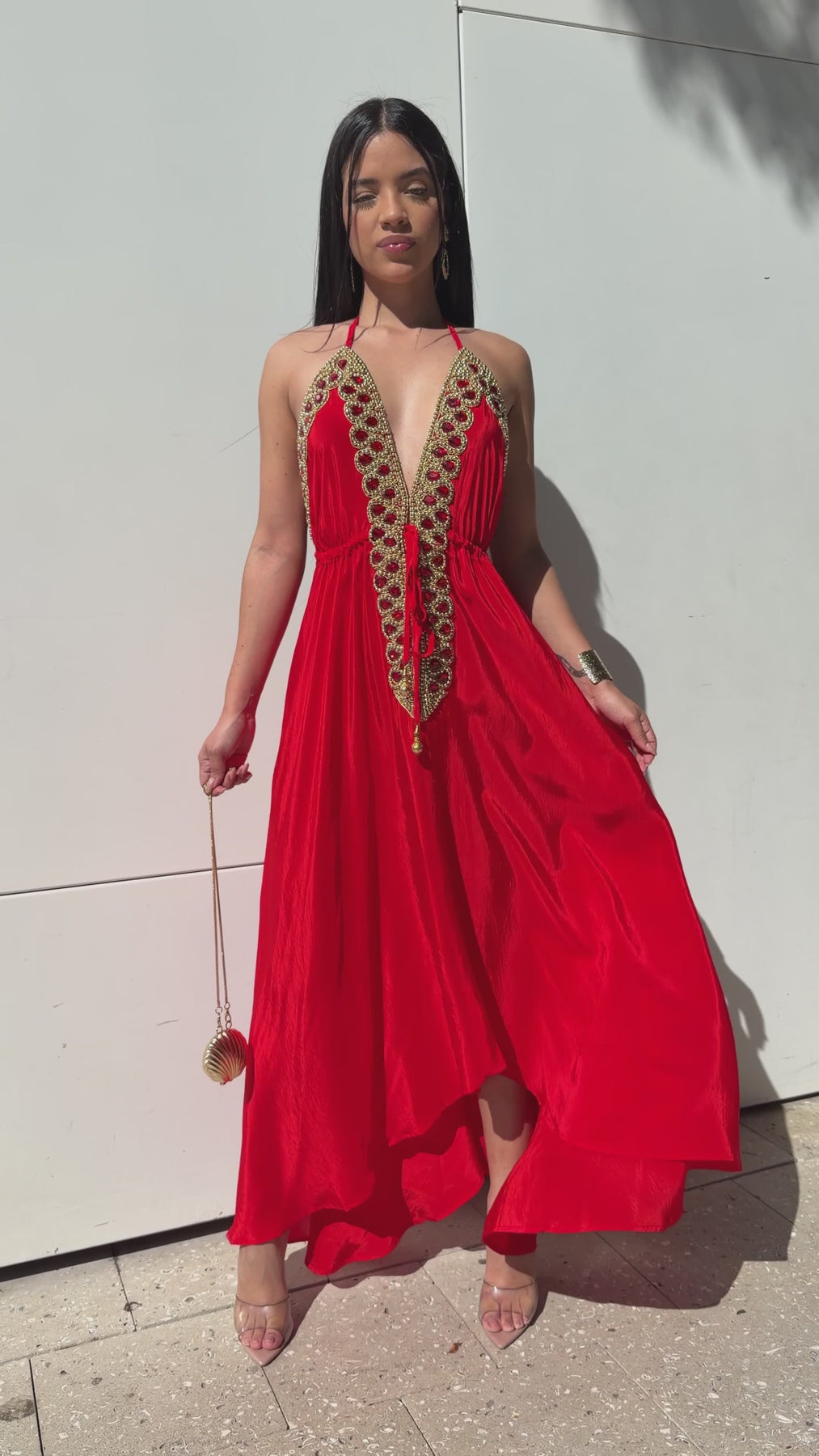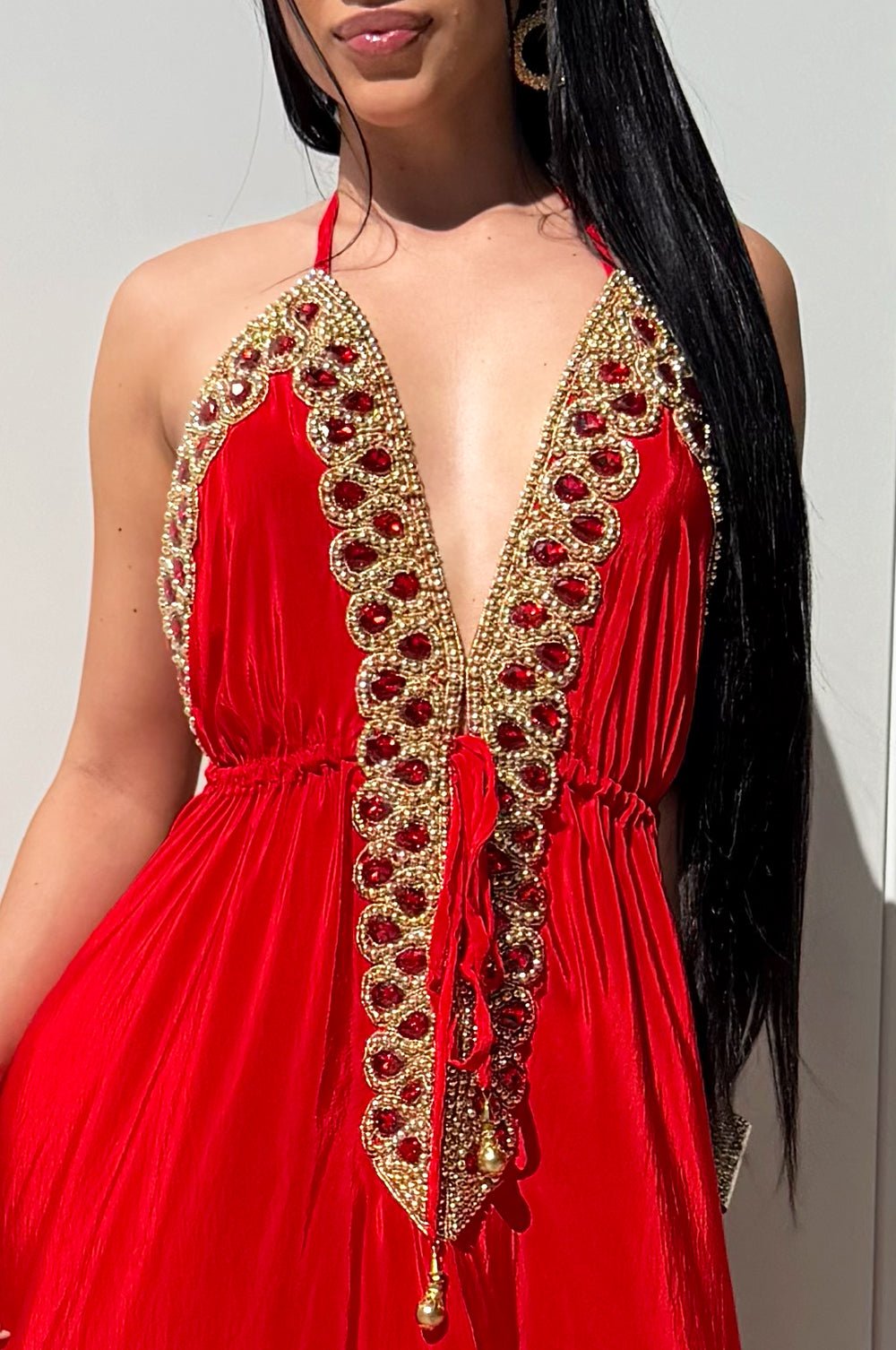 Regular price $119.99Slip into pure tropical vibes with this stunning red maxi that's equal parts glamorous and carefree. The jeweled halter neckline catches the light beautifully, while the adjustable drawstring waist lets you customize your fit for maximum comfort. Perfect for beach parties, resort getaways, or any occasion where you want to turn heads in effortless style.