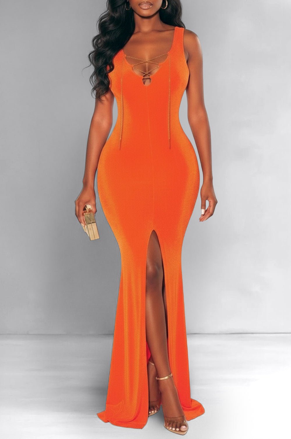 Tangerine Sleeveless Gold Chain Lace Up Slit Gown