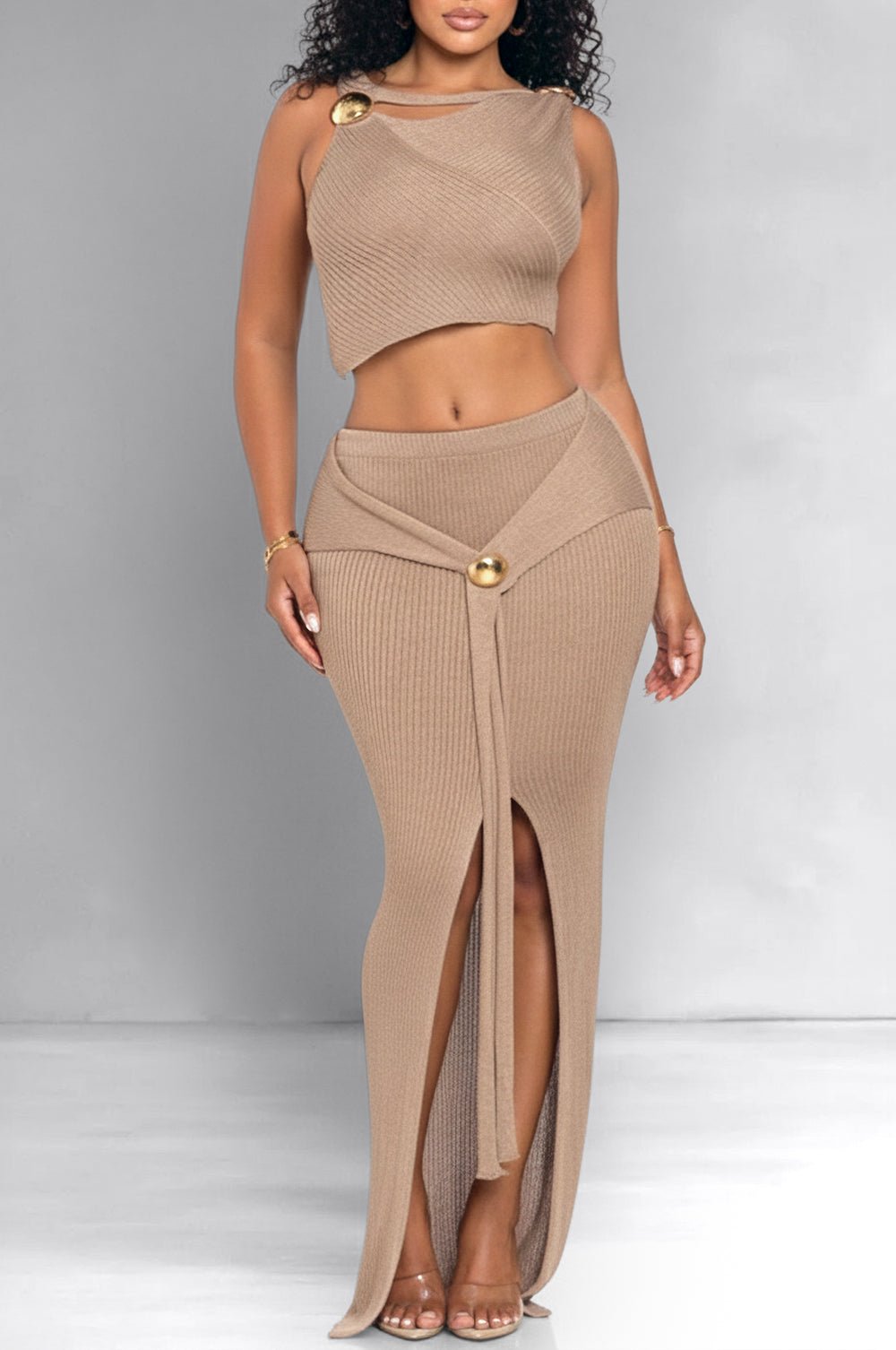 Taupe Gold Knit Cut Out High Slit Maxi Skirt Two Piece Set