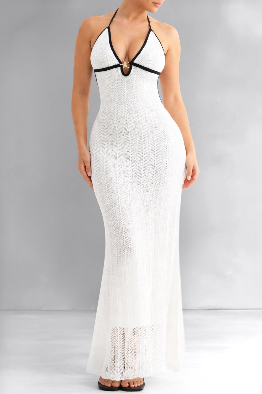 Regular price $64.99This luxe knit maxi dress features a fitted silhouette with contrast trim at the neckline and underbust. Designed with a halter neckline and open back, it has self-tie straps for an adjustable fit. The textured knit fabric adds subtle dimension, while the full-length skirt creates a sleek chic look.